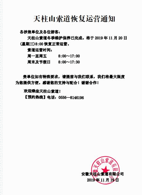 天柱山索道恢復(fù)運(yùn)營通知