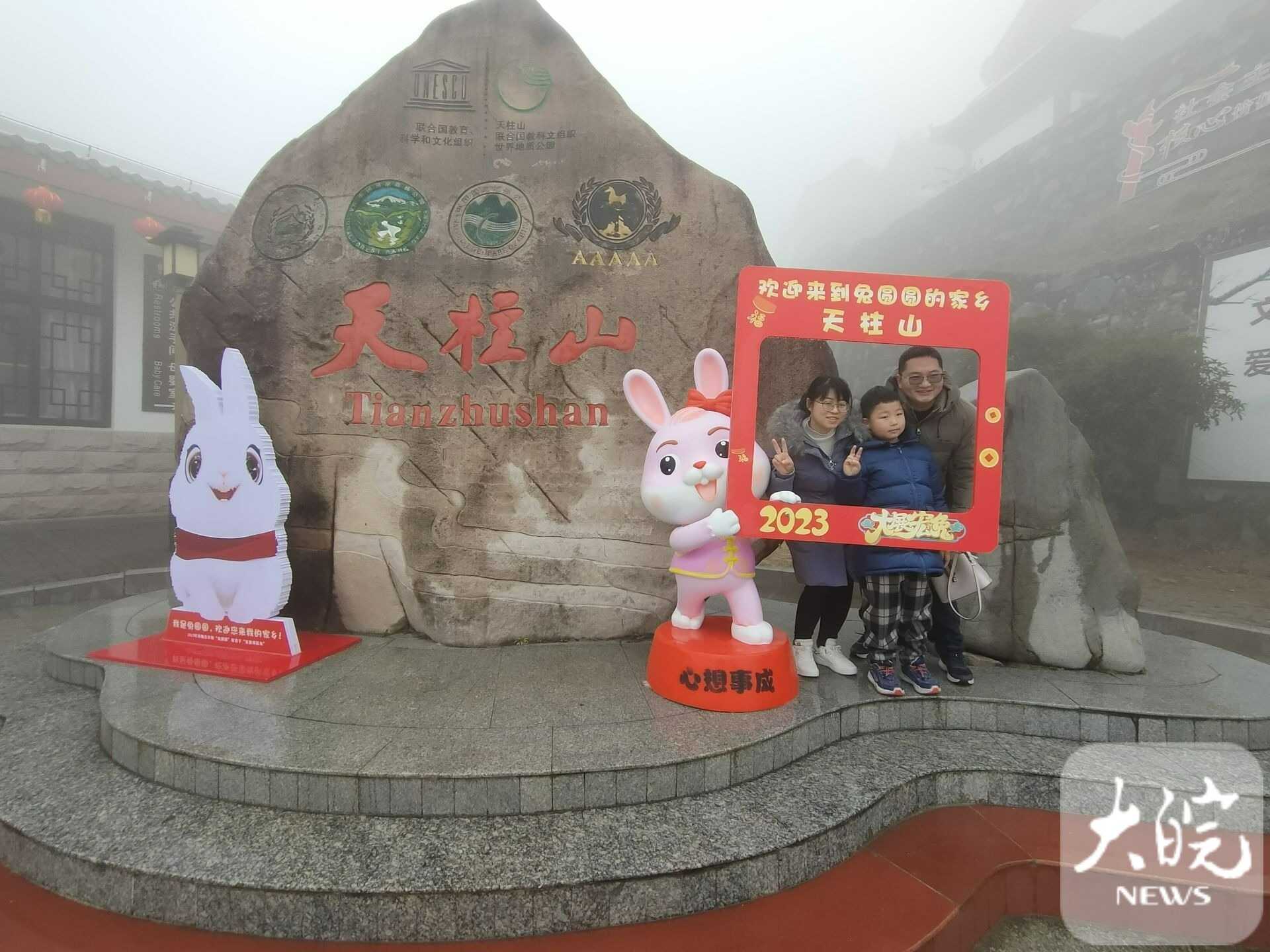春節(jié)假期,天柱山風(fēng)景美,年味濃,景區(qū)在馬祖、茶莊游客中心、天池峰等多處設(shè)有歡慶新年的“兔圓圓”卡通形象,游客在這里拍照,許下美好愿望。“今年春節(jié)帶著家人在天柱山旅游過年,提前在網(wǎng)上預(yù)訂好民宿,一家人開心快樂地體驗(yàn)山岳風(fēng)情,吃農(nóng)家菜、看民俗、滑冰雪、賞美景,體驗(yàn)“慢生活”,在“兔圓圓”故鄉(xiāng)過兔年,意義非凡。”來自上海的余先生開心地說。